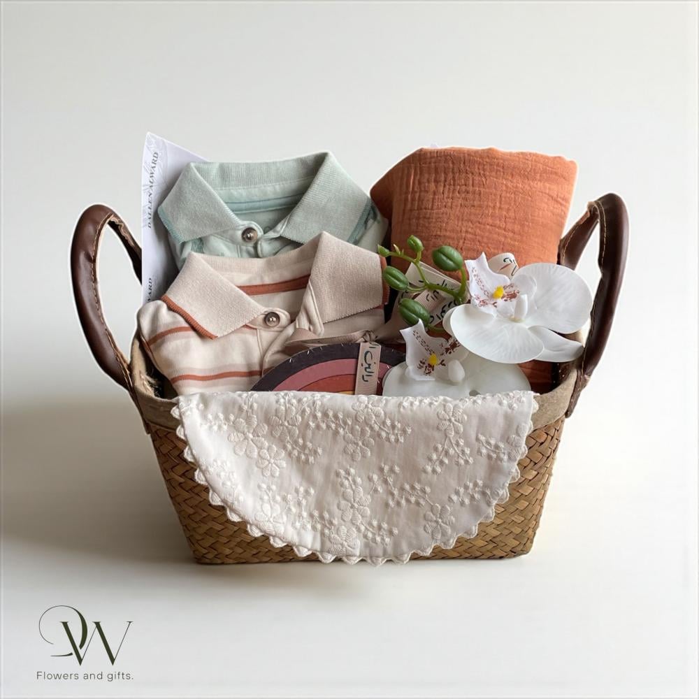 💐 تأتي الهدية داخل سلة من الخوص الطبيعي مزينة بلمسات أنيقة، لتكون خياراً مثالياً للأم والمولود